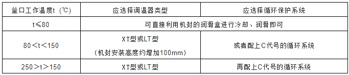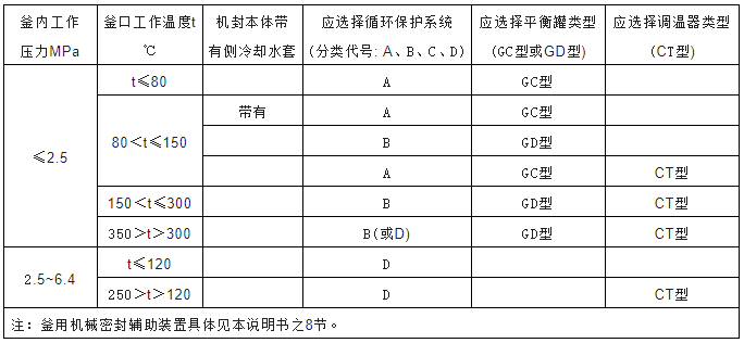 (1)单端面机械密封,可根据釜内介质温度选用辅助装置的原则见表1。